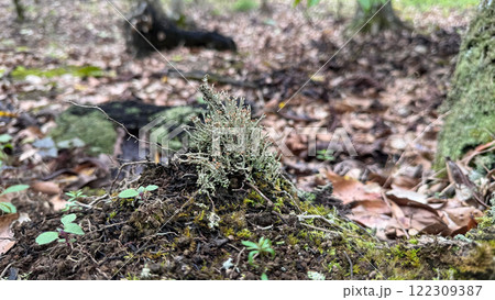 Lichen-covered soil surrounded by plants and leaf litter