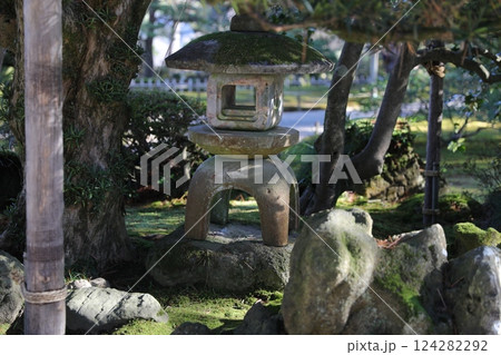 Traditional Japanese stone lantern with detailed engravings shows signs of aging with moss