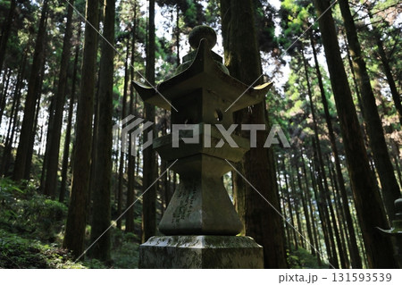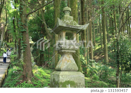 Ancient stone lantern covered in moss and lichen at Toshogu Shrine in Nikko