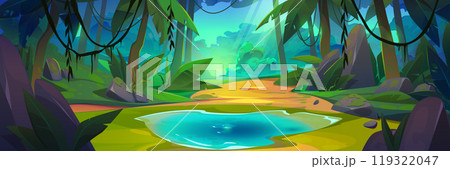 calm scene with vertical stone pillar surrounded by evergreen trees and intricate landscape features