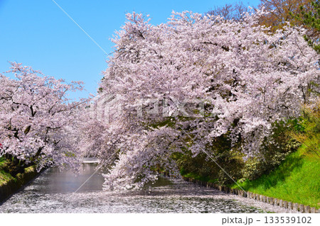 盛開的櫻花和護城河的風景、觀光船、弘前城