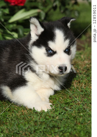 Amazing siberian husky lying in front of red flowers