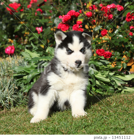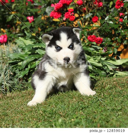 Amazing puppy of siberian husky sitting in the garden