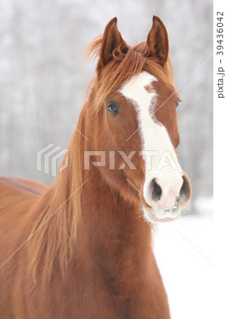 Portrait of nice chestnut horse in winter