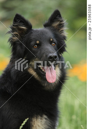 Beautiful German Shepherd dog sitting in flowering field
