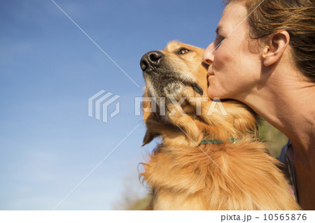 A girl in a bikini lying beside a golden retriever dog, viewed from above.