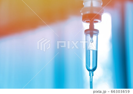 Chemotherapy drug medical holding hypodermic syringe needle injection iv bag fluid intravenous drop saline drip hospital room concept treatment palliative care.selective focus.blue light background,