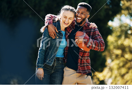 Love, diversity couple and laughing in nature, having fun and playing football outdoors. Comic, interracial romance and happy black man and woman hug, laugh at funny joke and enjoying time together.