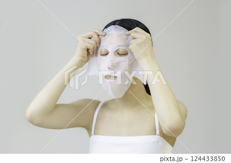 Closeup portrait of young pretty woman applying paper sheet mask on her face. Cosmetic procedure. Beauty spa and cosmetology.