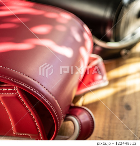 紅色皮革書包(帶黃色封面)的圖像插圖
