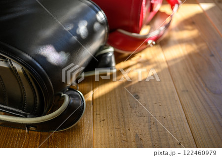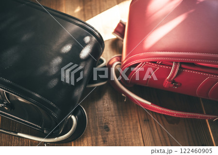 紅色和黑色皮革書包(帶黃色封面)的圖像插圖