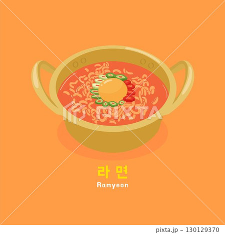 韓式辣拉麵。用火鍋盛裝,上面放有雞蛋、辣椒片和蔥花。