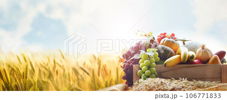 Rich Chuseok holiday and church Thanksgiving decoration with various crops, vegetables and fruits, and harvest season autumn ripe golden barley field farm landscape, banner and banner background