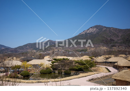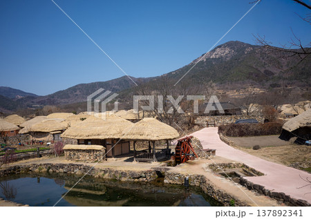 Korean traditional village with thatched roof houses in Nagan Eupseong, South Korea