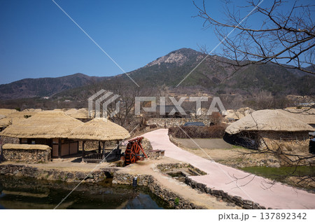 Curved pathway and traditional village with waterwheel in Nagan Eupseong, South Korea