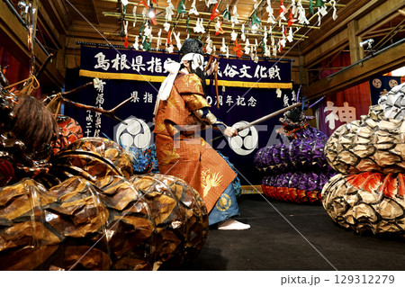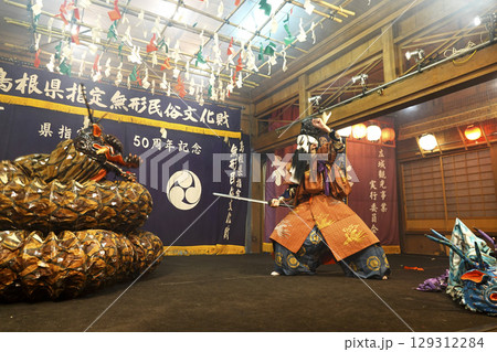 石見神樂(夜神樂)表演者扮演主角,試圖殺死神社禮拜殿舞台上盤繞自己的巨蛇。