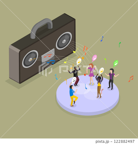 3D Isometric Flat Vector Illustration of Radio Recorder, Happy Person Listening To Music
