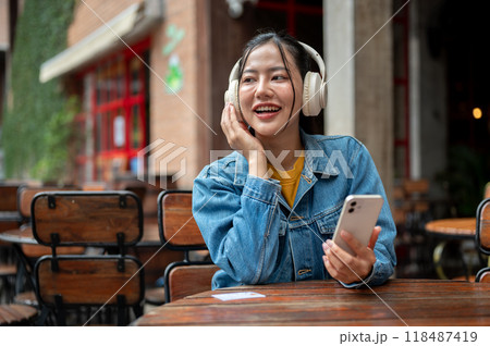 A happy Asian woman enjoying listening to music through her headphones at a restaurant.