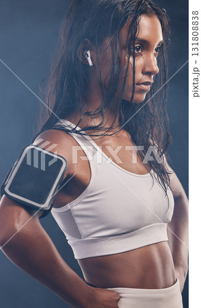 Black woman profile, studio and training with earphones for fitness, phone and music for focus mind. Gen z girl, personal trainer and smartphone for vision, motivation and mindset for workout goal