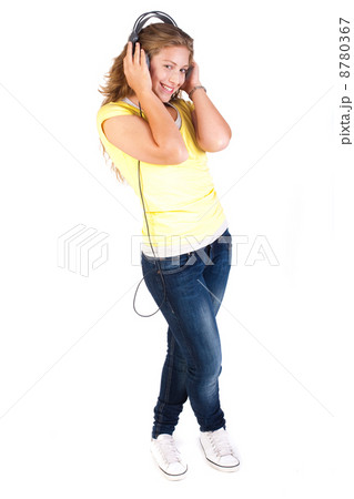 Happy female teenager enjoy music