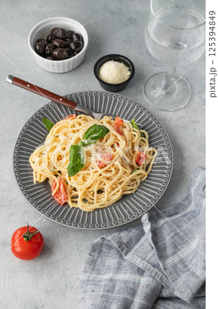 Creamy spaghetti with cherry tomatoes, parmesan cheese and basil on a plate on a light background