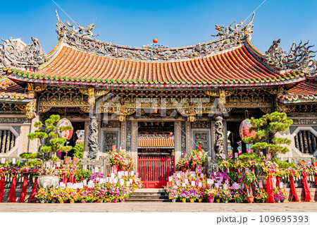 Asia culture concept - Roof with beautiful decoration of famous heritage landmark, the traditional old oriental Taiwanese temple.