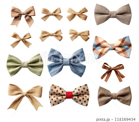 Collection of handmade romantic ribbon bow tie and linen tape bow. Set of of eco-friendly decor from recycled material. Isolated on white background. Nostalgic scrapbooking style