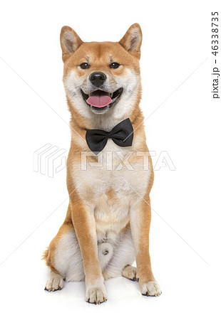 British shorthair cat in bow tie sitting on white background. Isolated pet portrait