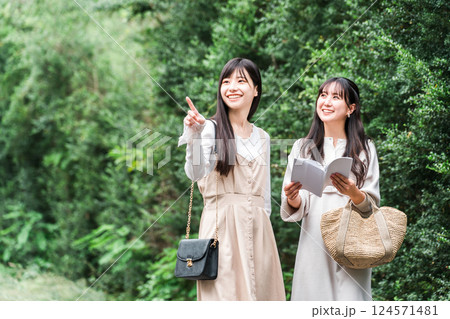 年輕的亞洲女性一邊看旅遊指南一邊在旅遊景點周圍散步(女孩的旅行、旅行、旅遊)