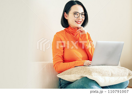 年輕女子坐在沙發上和遠程辦公