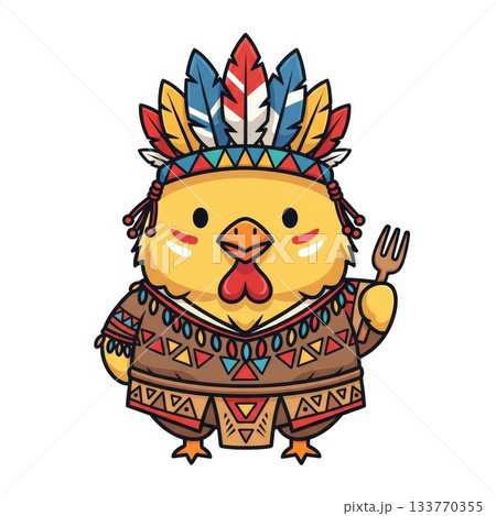 Cute Chibi Chicken in Colorful Tribal Warrior Attire Illustration