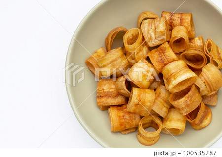 Crisps fried with salt, spices and garlic. Cooked potatoes