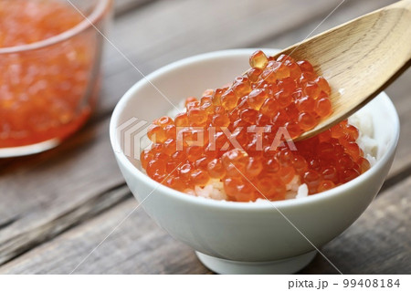 筷子夾著用醬油醃製的鮭魚子。米飯上鋪滿了大量的鮭魚。