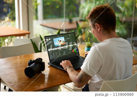 Male video editor working on creative software to create montage, using color correction and adding visual effects. Content creator editing graphics and gradient for movie post production. Camera A.
