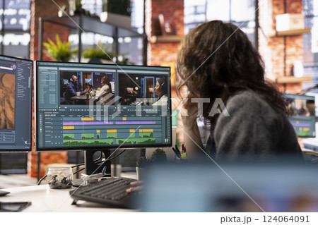 Female expert editor working in video production industry at agency office, doing color grading and creating a montage on dual monitors. Creative process with multimedia tech tools. Camera B.