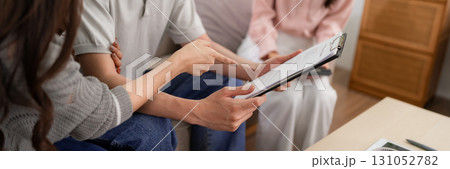 Asian adult insurance salesperson explaining health policy documents to couple at home living room private consultation trusted financial advice for families