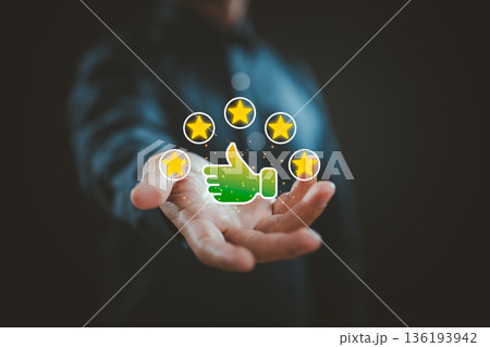 Businessman holding five star rating with thumbs up icon for customer review and positive feedback