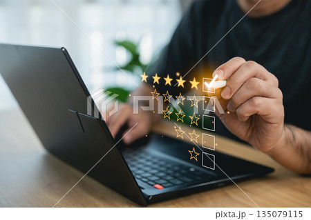Positive customer feedback evaluation, person uses laptop for online survey, giving 5 star rating for excellent service experience, showing happy client satisfaction with business quality