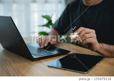 Neutral customer feedback survey icon reflects user satisfaction, man engaged with laptop and phone performs service quality assessment, crucial for continuous business improvement strategy