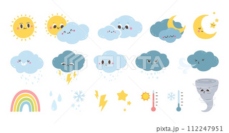 Weather forecast characters. Cute cartoon summer and winter signs, funny spring and fall icons. Night and day symbols, sun and moon. Vector collection
