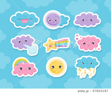 Cute Weather Stickers with Moon, Cloud and Star Vector Set