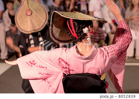日本夏季節慶上,一名女子跳城鎮流水舞的插圖
