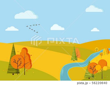Autumn scenic field landscape background with yellow and orange trees, spruces, fields, river