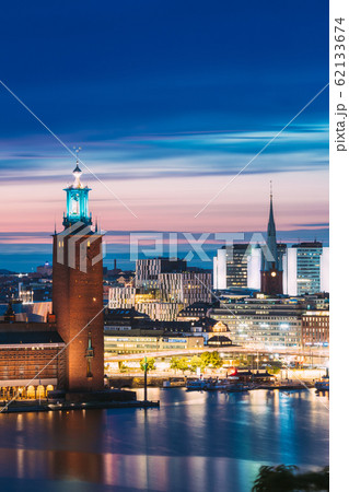 Stockholm, Sweden. Scenic Skyline View Of Famous Tower Of Stockholm City Hall And St. Clara Or Saint Klara Church. Popular Destination Scenic View In Sunset Twilight Dusk Lights. Evening Lighting