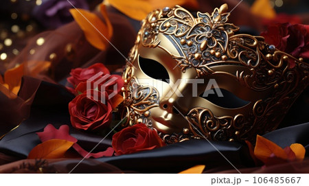 Venetian carnival mask and beaded jewelry on a woman, close-up. Von Mardi Gras. Venice Carnival