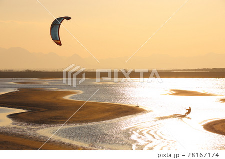 kite surfer maneuvers skillfully across vast winter landscape under vibrant sunset sky.