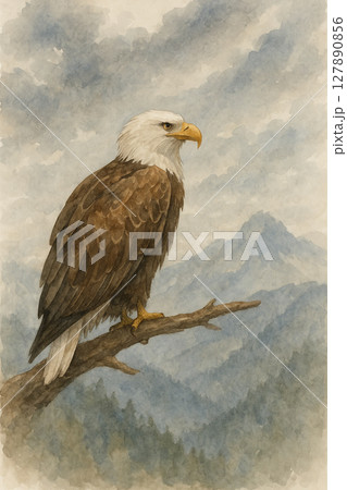 山上雄鷹 | 一幅古老的雄鷹插畫,象徵自由而強大的力量 | 雄鷹的威嚴 | 雄鷹佇立於山巔的水彩畫