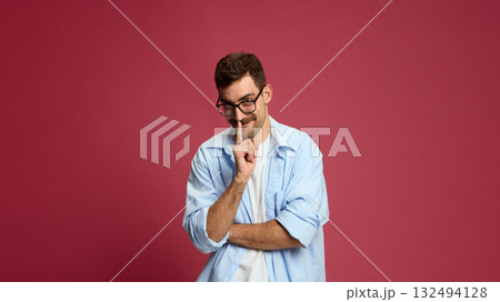 Smiling man showing secret gesture with playful and mysterious expression