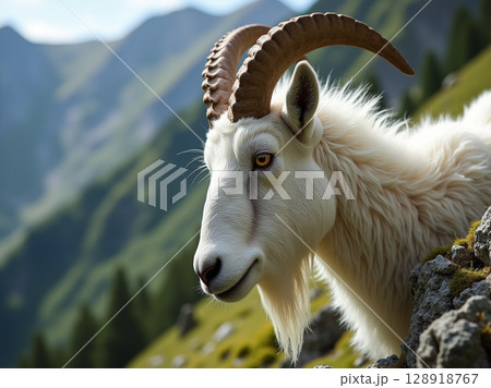 Extreme Close-Up of White Mountain Goat with Curved Horns and Textured Fur on Rocky Terrain in Alpine Forest Background