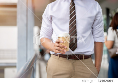 Close up businessman office worker holding coffee hand in pocket standing on pedestrian footbridge